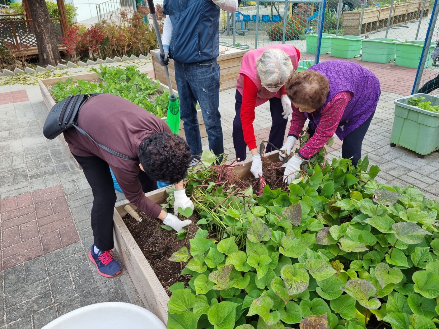 어르신들께서는 흙이 묻는 것도 잊은 채, 호미와 장갑을 끼고 텃밭에 옹기종기 모여 앉으셨습니다. "어디에 숨었나~", "이쪽을 파보자!" 고구마 줄기를 힘껏 잡아당기자 땅속에 숨어있던 튼실한 고구마들이 모습을 드러냈고, 텃밭 여기저기서 "우와!", "찾았다!" 하는 즐거운 탄성이 터져 나왔습니다.