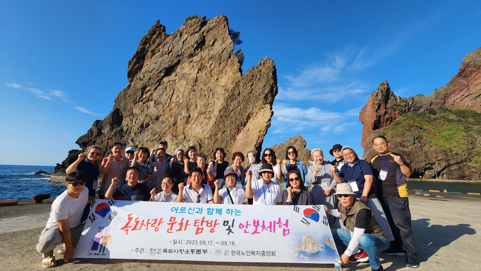 어르신들의 가장 큰 소원 중 하나였던 "우리 땅 독도 밟아보기" 버킷리스트가 드디어 이루어졌습니다! (사)한국노인복지중앙회의 지원으로 2박 3일간 진행된 이번 '독도사랑 문화 탐방'은 맑은 날씨까지 허락되어 더욱 특별했습니다. 푸른 동해를 건너 늠름하게 서 있는 독도의 절경을 마주한 어르신들은 벅찬 감동을 감추지 못하셨습니다. 태극기와 현수막을 들고 한마음으로 "독도는 우리 땅!"을 외치며 잊지 못할 감동의 순간을 함께했습니다.