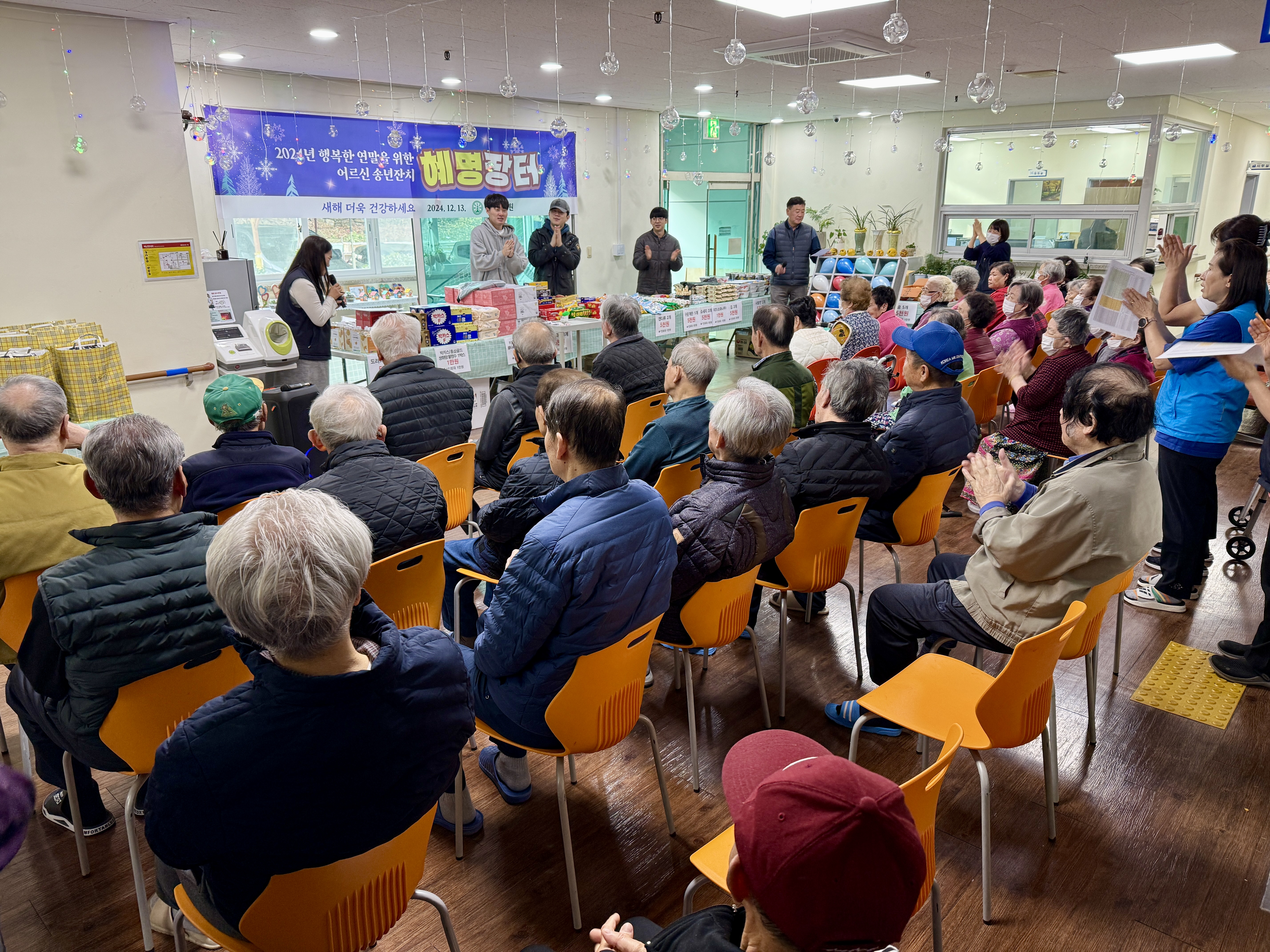 지난 12월 13일 금요일, 혜명양로원에는 설렘과 웃음이 가득했습니다. 한 해를 마무리하며 어르신들께 즐거운 추억을 선물해 드리기 위해 '2024년 행복한 연말을 위한 어르신 송년잔치 - 혜명장터'가 열렸기 때문입니다.