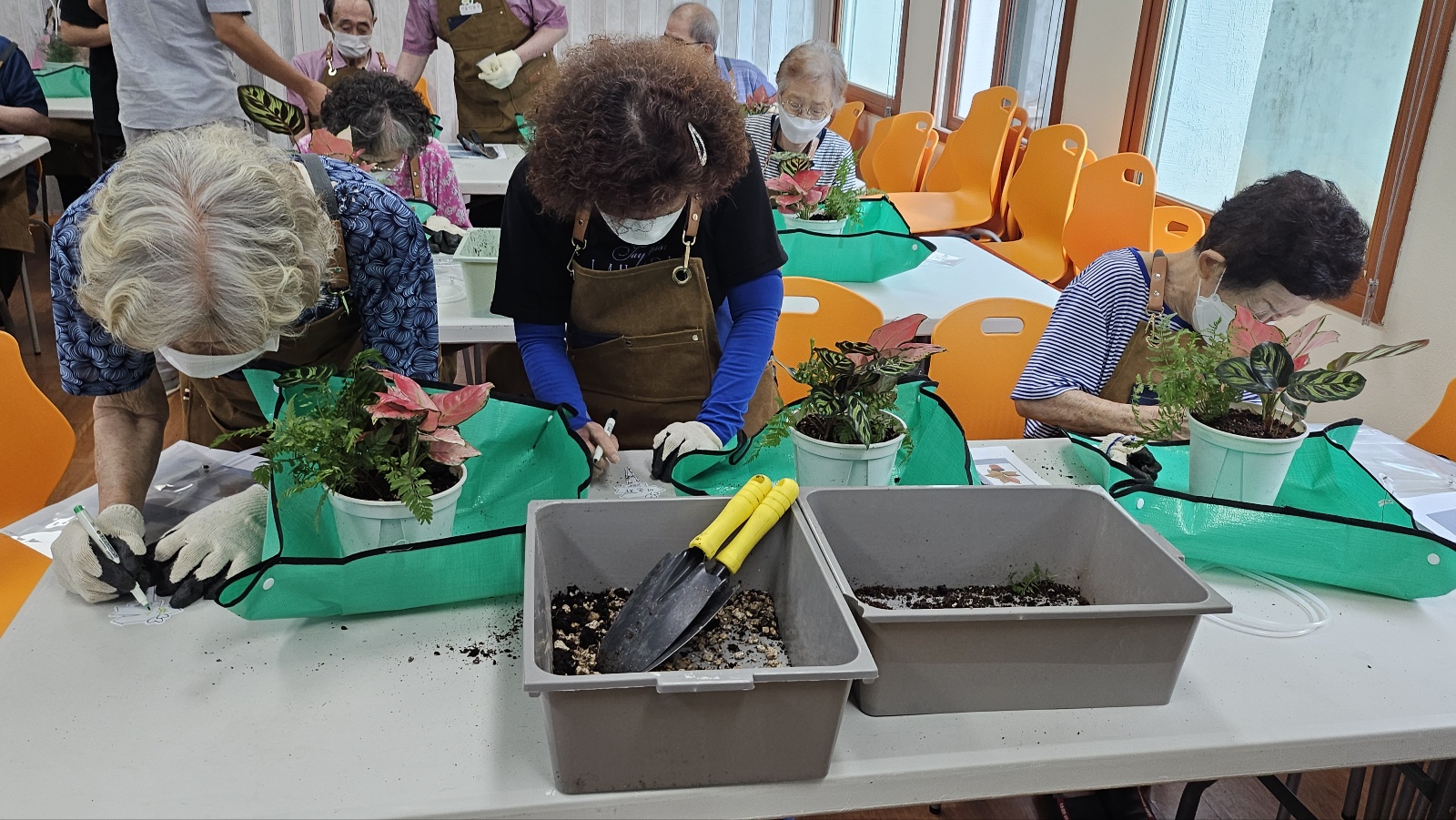어르신들은 전문가의 지도에 따라 앞치마를 두르고, 작은 모종삽을 손에 쥔 채 '일일 가드너'가 되셨습니다. 고사리 같은 손으로 화분에 흙을 담고, 알록달록한 식물을 조심스럽게 옮겨 심으시며 프로그램에 집중하셨습니다.