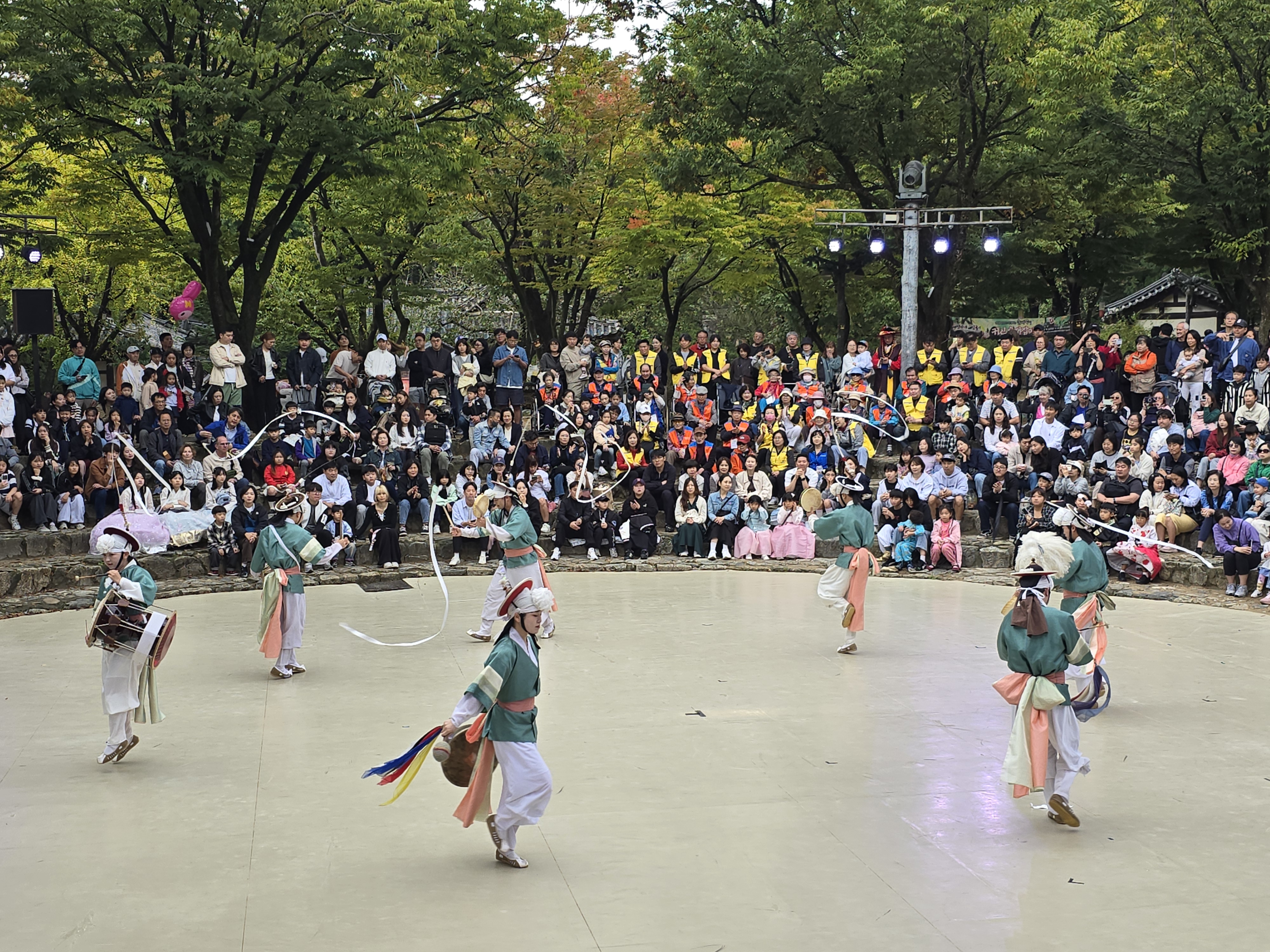 단풍이 곱게 물든 민속촌에서 어르신들은 봉사자분들의 도움을 받아 편안하게 산책을 즐기셨습니다. 야외 마당에서 펼쳐진 흥겨운 풍물놀이와 전통 공연을 관람하며, 어깨춤을 추고 박수를 보내는 등 즐거운 시간을 보내셨습니다.