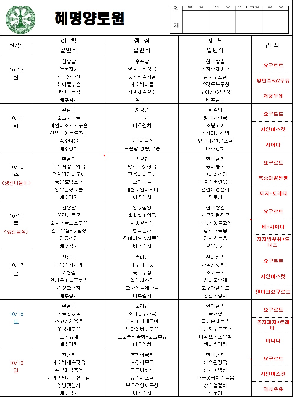 25년 10월 3주차 주간식단표