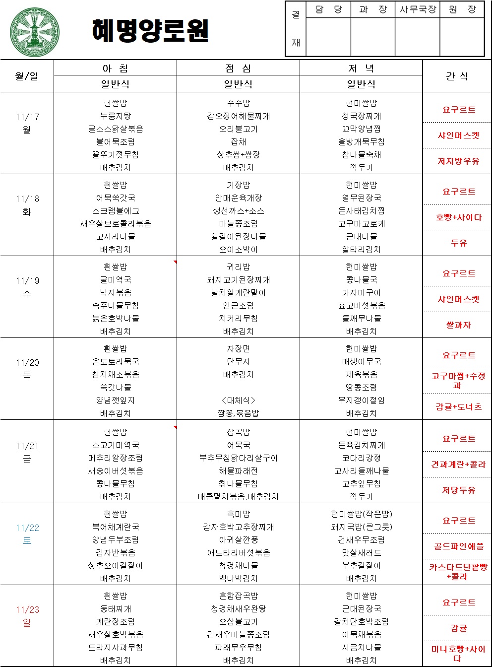 25년 11월 3주차 주간식단표