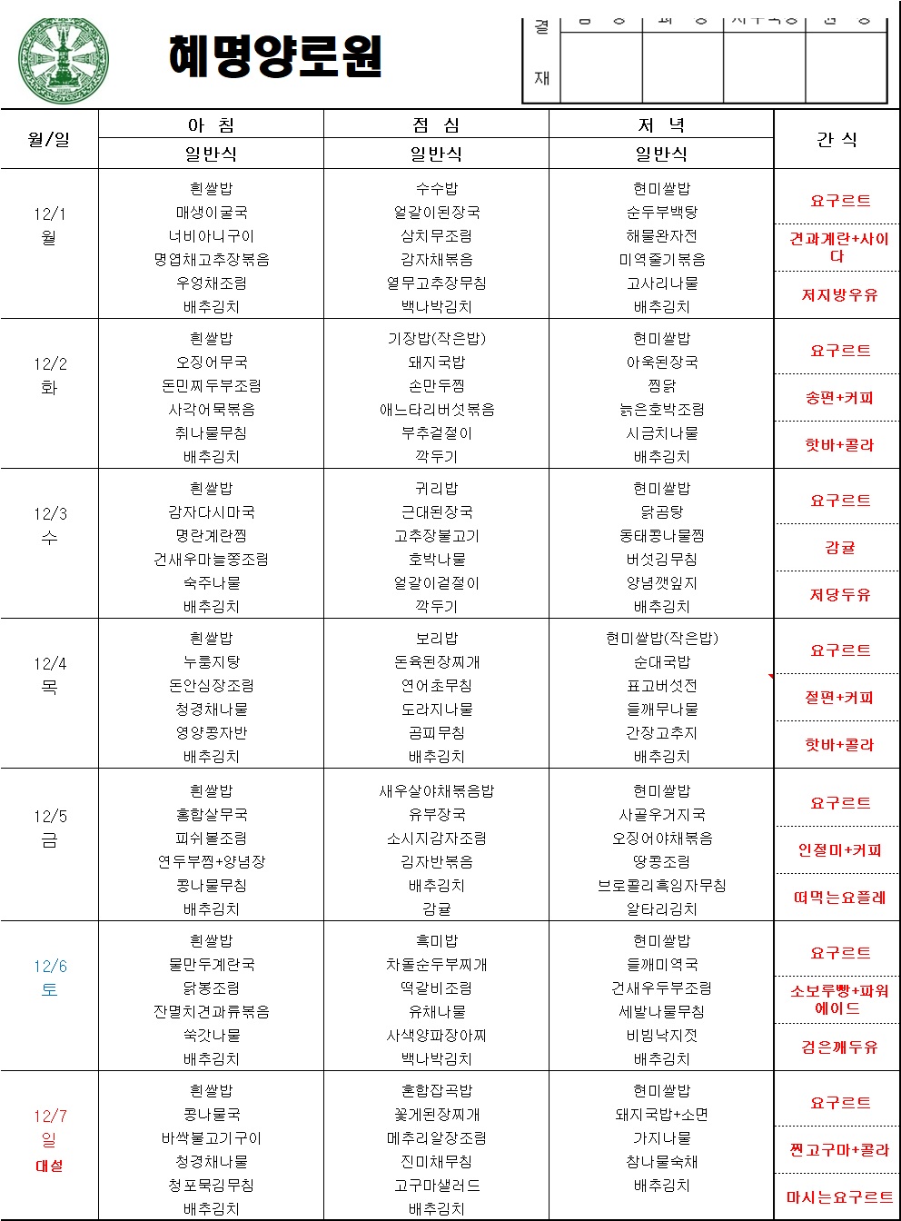25년 12월 1주차 주간식단표