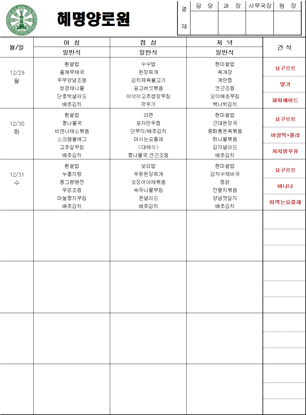 25년 12월 5주차 주간식단표