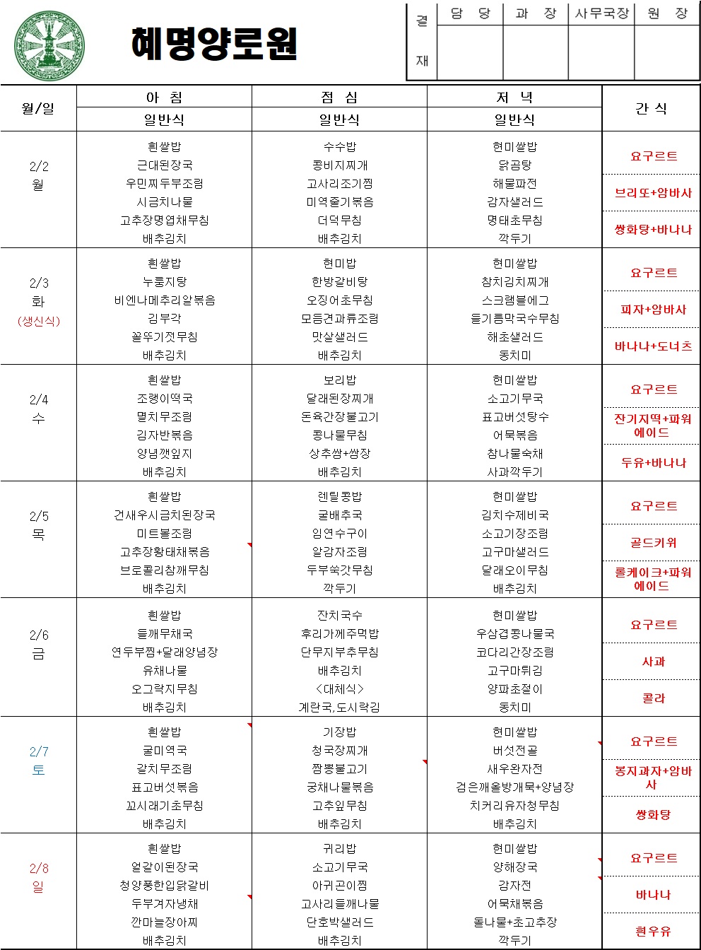 26년 2월1주차 주간식단표