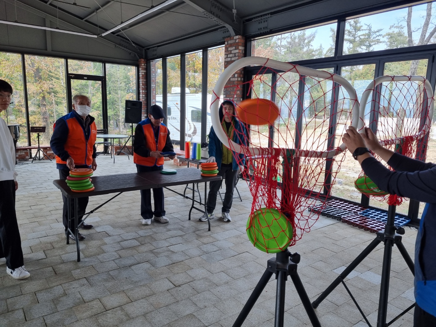 즐거운 나들이에 레크레이션이 빠질 수 없겠죠? 실내에 마련된 공간에서 원반을 던져 넣는 디스크 골프 등 신나는 신체 활동 게임을 진행했습니다. 어르신들은 '영차!' 힘을 주어 원반을 던지시며 숨겨둔 실력을 뽐내시기도 하고, 동료들의 도전을 응원하며 한바탕 웃음꽃을 피웠습니다.