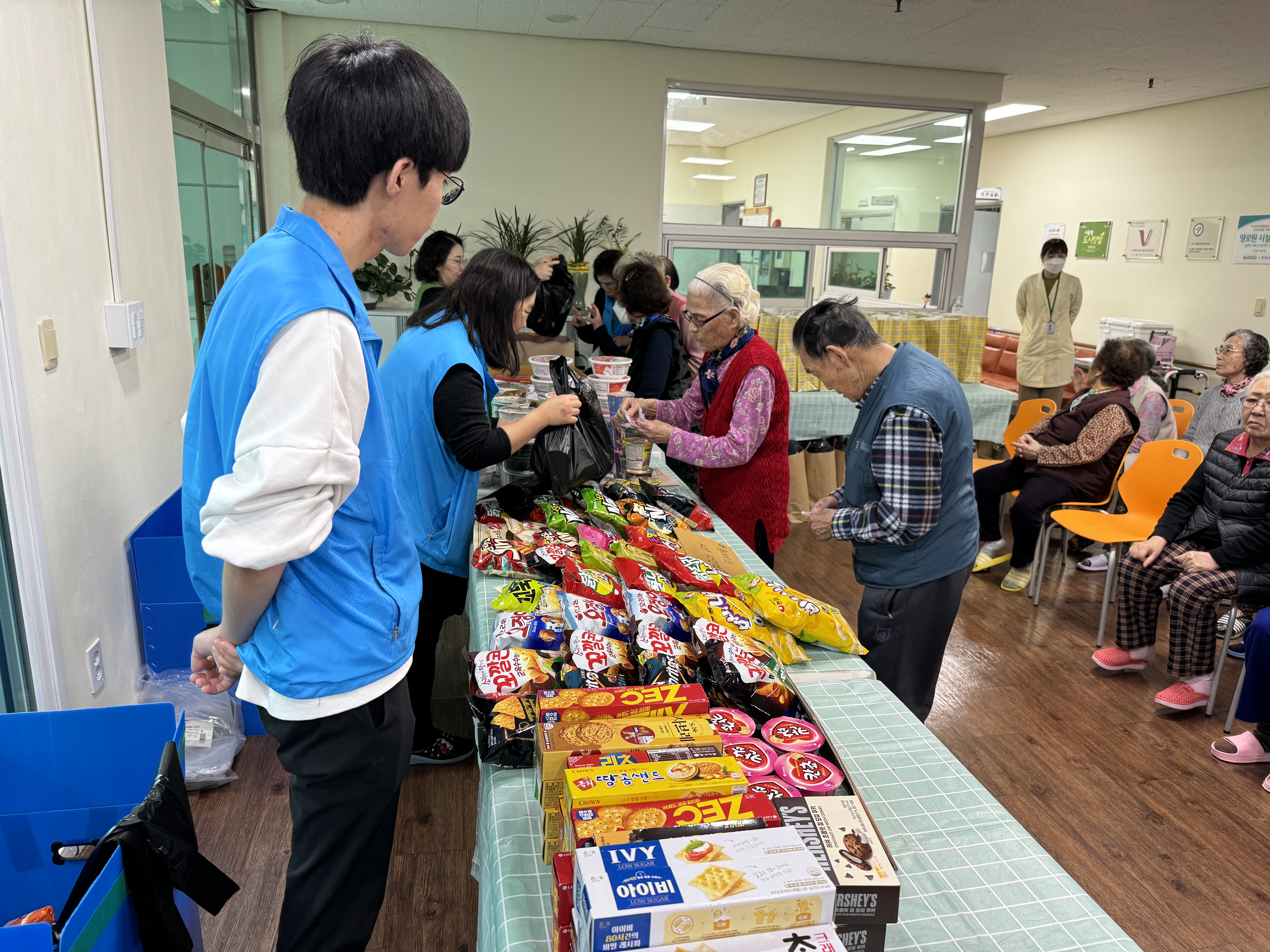 (사진 참고: 혜명장터) 장터 테이블에는 어르신들이 좋아하시는 각종 과자, 음료, 생필품 등이 가득 채워졌습니다. 어르신들은 손수 모은 상품권으로 "어떤 걸로 살까?" 행복한 고민을 하시며, 원하는 물건을 골라 담는 즐거운 '쇼핑' 시간을 만끽하셨습니다.