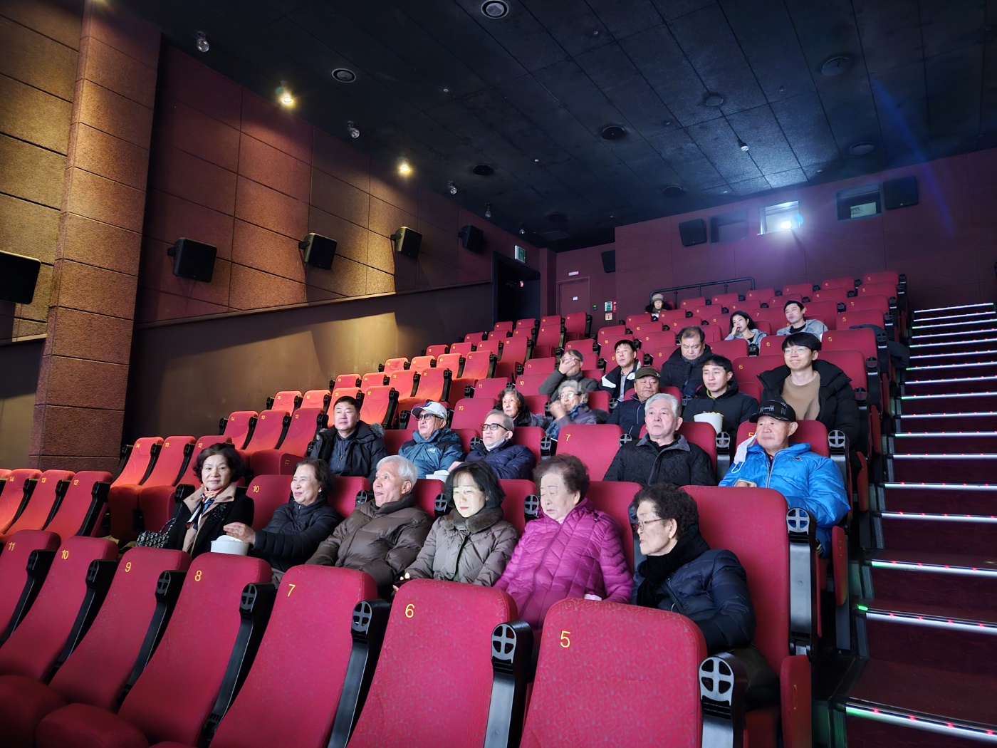 (사진 참고: 영화관) 어르신들은 오랜만의 영화관 나들이에 설렘을 감추지 못하셨습니다. 다 함께 최신 영화를 관람하며, 팝콘 대신 이야기꽃을 피우고 주인공의 이야기에 함께 웃고 울며 즐거운 2시간을 보내셨습니다. 다 함께 영화관 앞에서 "내 인생의 봄" 현수막을 들고 단체 사진을 찍으며, 오늘 이 순간의 행복을 기억에 남겼습니다.