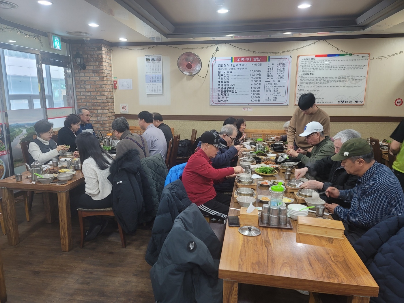 (사진 참고: 식당) 영화 관람 후에는 따끈한 국물과 맛있는 음식이 기다리는 식당("우정식당")으로 이동했습니다. 어르신들은 김이 모락모락 나는 불고기 전골과 맛있는 식사를 함께 나누시며, 방금 본 영화 이야기도 나누고 서로의 안부도 묻는 정겨운 시간을 가졌습니다.