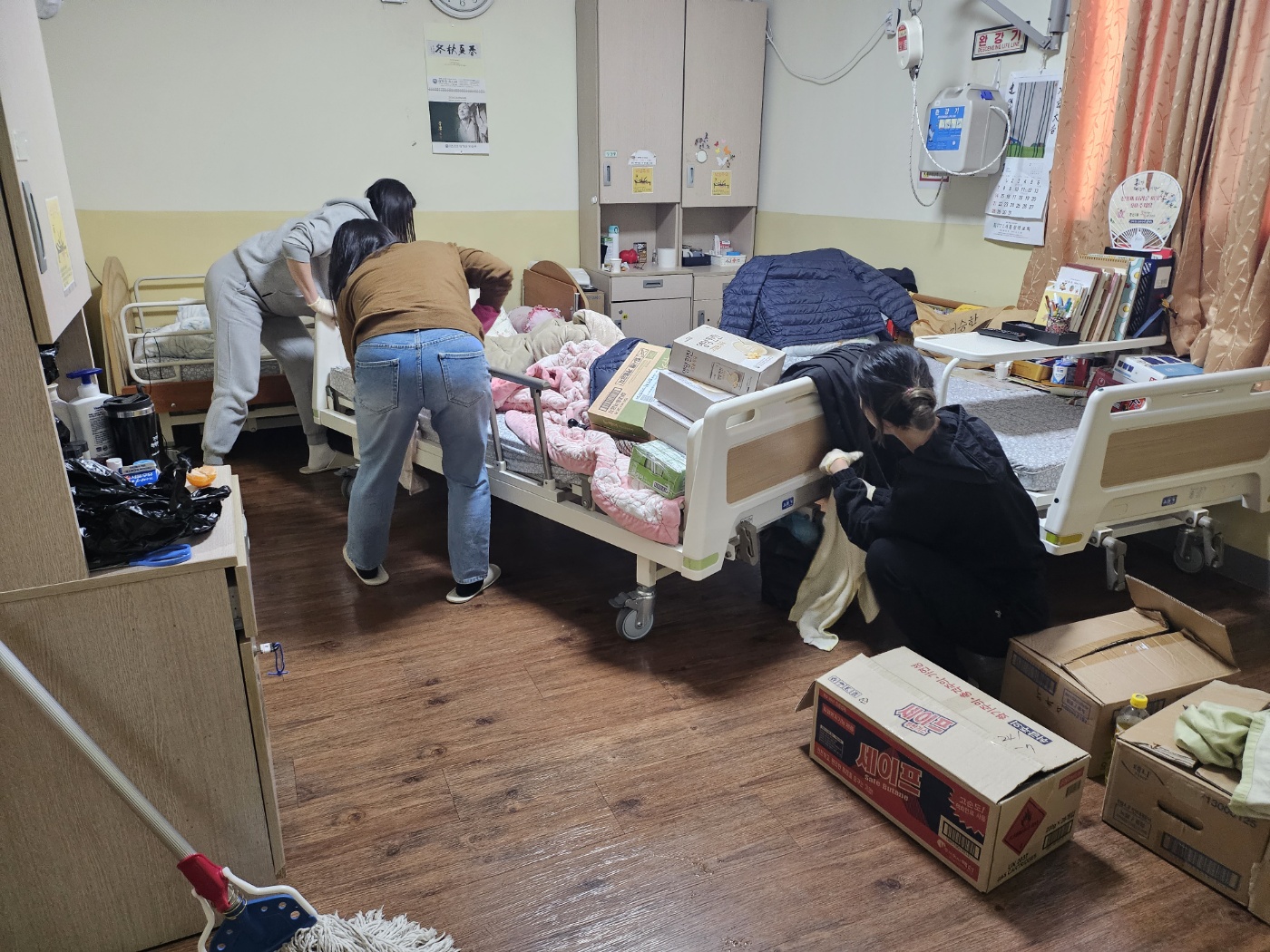 (사진 참고: 생활실 청소) 봉사단원분들은 어르신들이 생활하시는 생활실 구석구석을 꼼꼼하게 청소하고, 어르신들의 손길이 닿기 어려운 물품 정리까지 도맡아 주셨습니다. 묵은 먼지를 닦아내고 어지러운 물건들을 가지런히 정돈하며, 어르신들의 공간을 더욱 깨끗하고 안락한 보금자리로 만들어 주셨습니다.