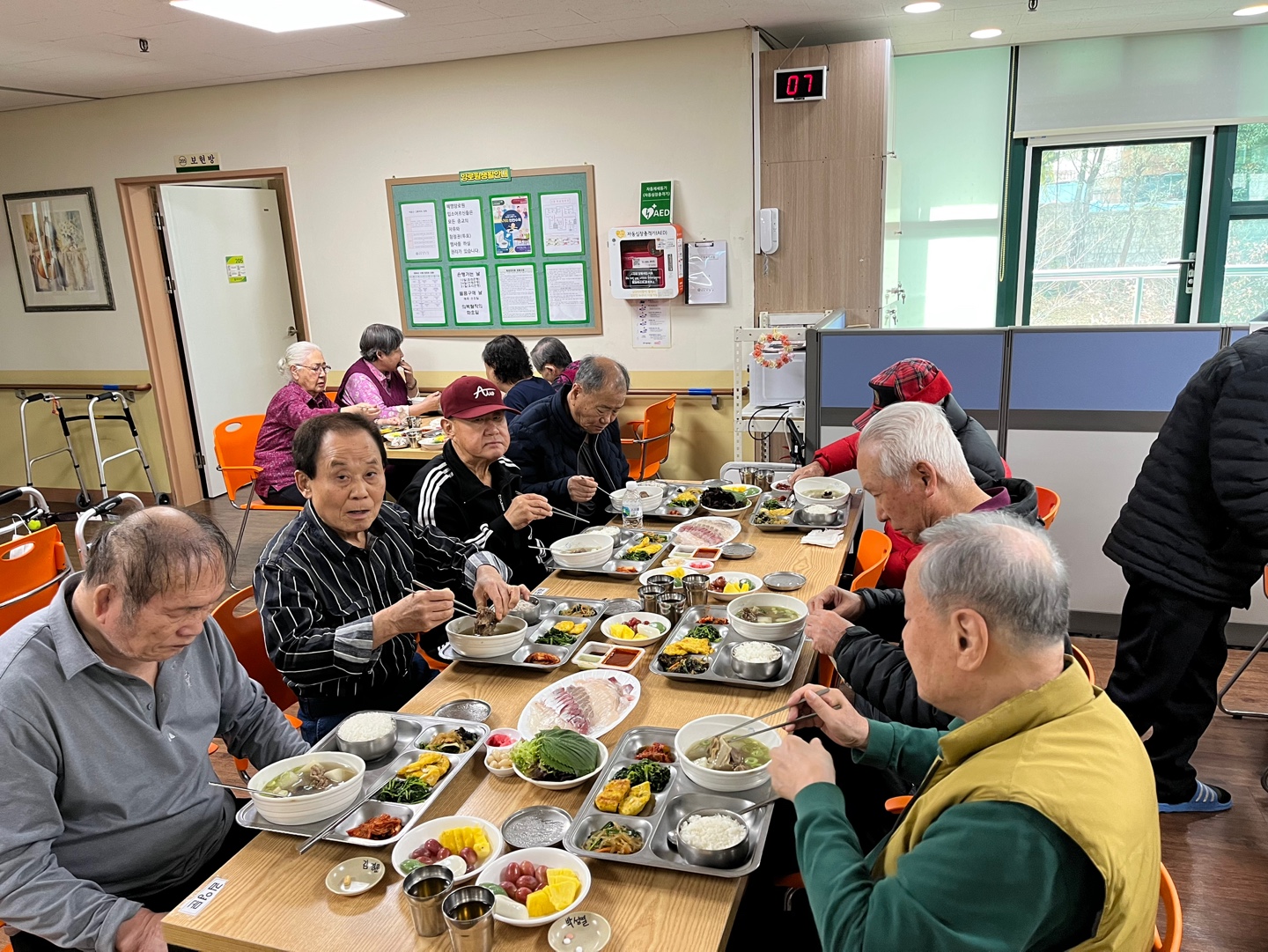 신나게 몸을 움직인 후에는 송년회에 빠질 수 없는 특별한 점심 식사가 기다리고 있었습니다. 추운 날씨에 몸을 녹여줄 뜨끈하고 푸짐한 '왕갈비탕'과 신선한 '회', 그리고 알록달록한 과일까지! 임금님 수라상 부럽지 않은 풍성한 한 상 차림을 대접해 드렸습니다.