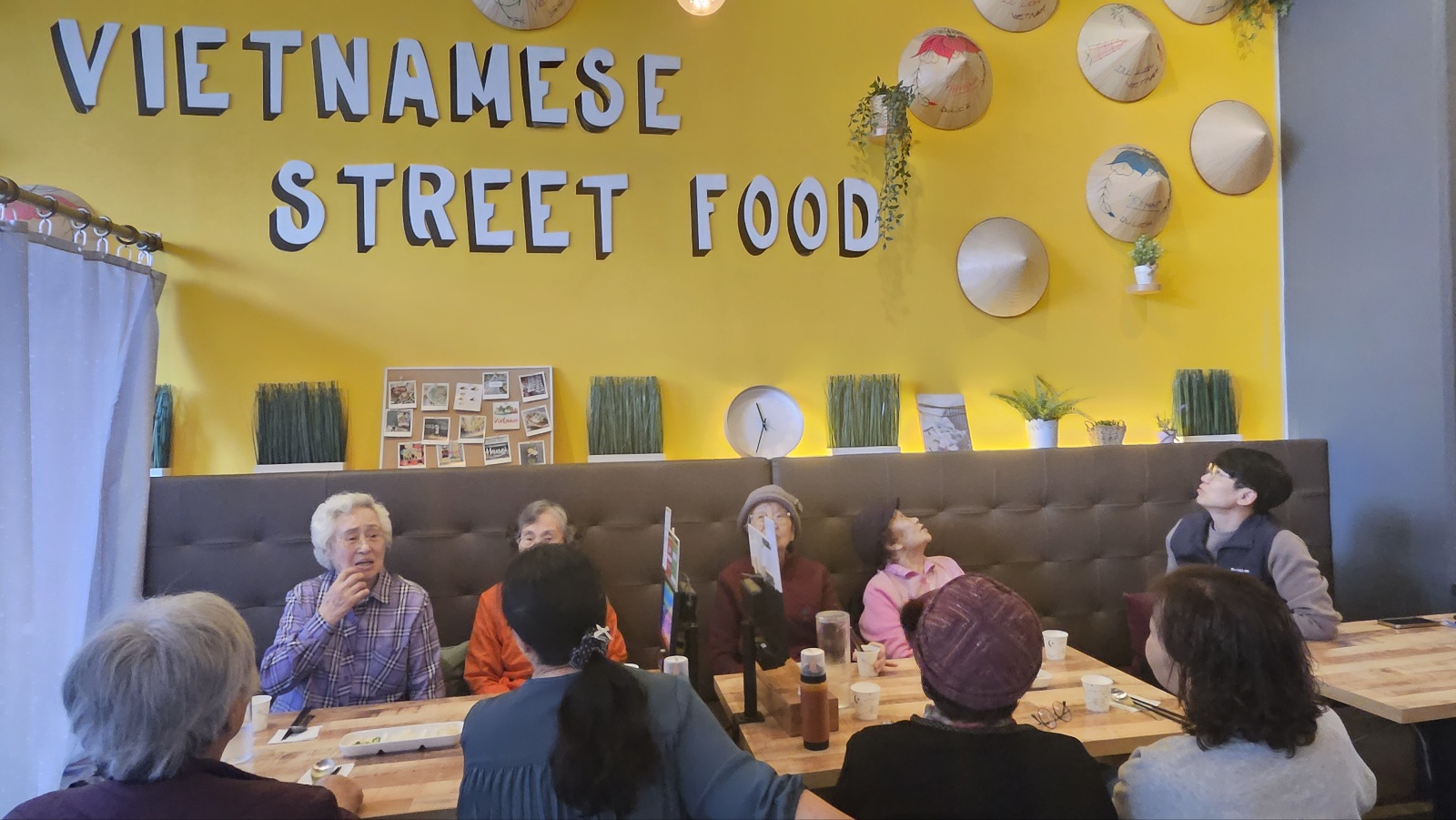 이번 여행지는 미식의 나라 베트남입니다. 노란색 벽과 베트남 전통 모자로 장식된 식당에 들어서니 마치 현지 여행을 온 듯한 이국적인 분위기가 물씬 풍겼습니다. 낯설지만 설레는 마음으로 식당을 둘러보시는 어르신들의 눈빛에 호기심이 가득했습니다.