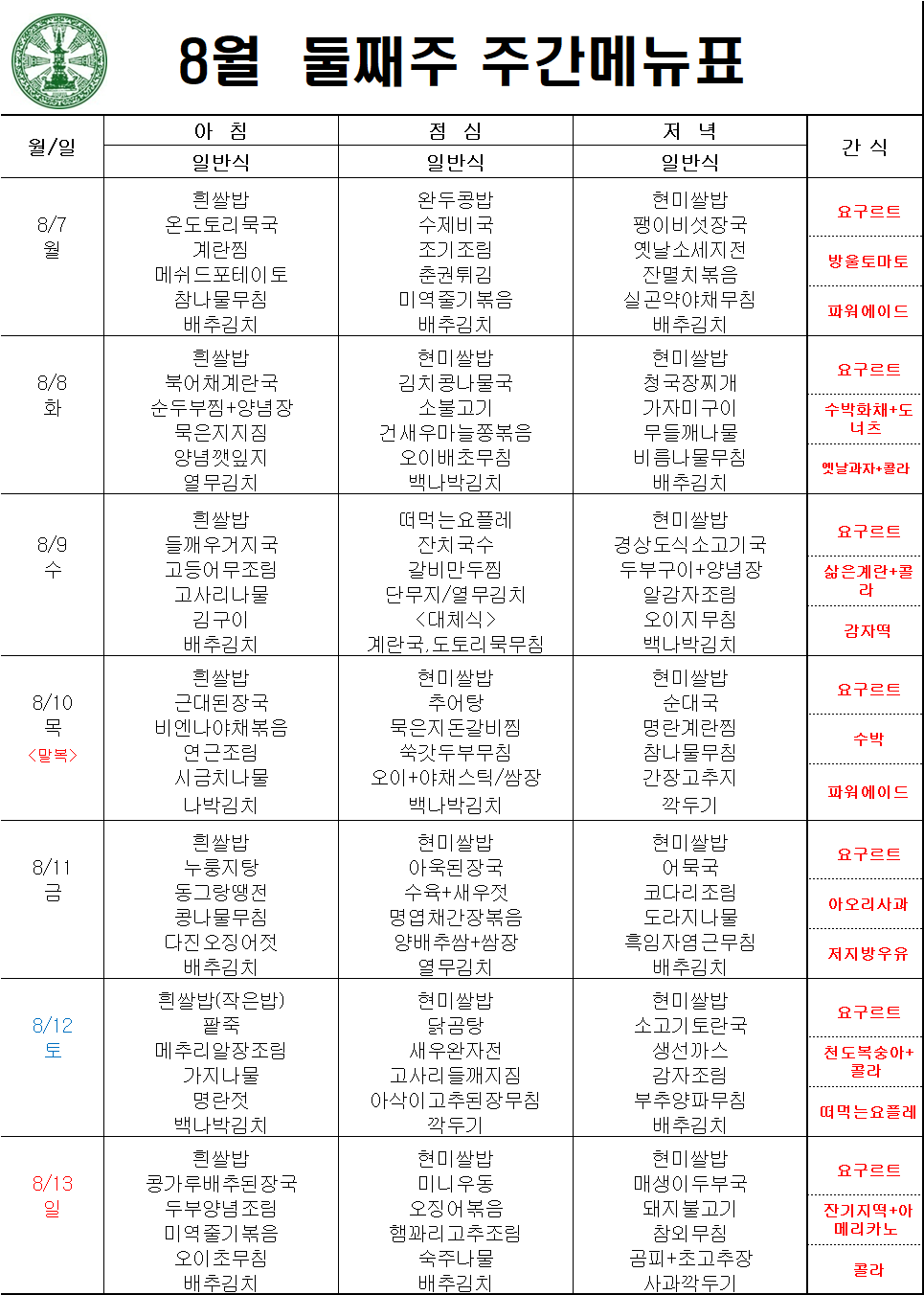 | 1461 | 24년 6월 2주차 주간식단표 | 24-06-10 | 관리자 |