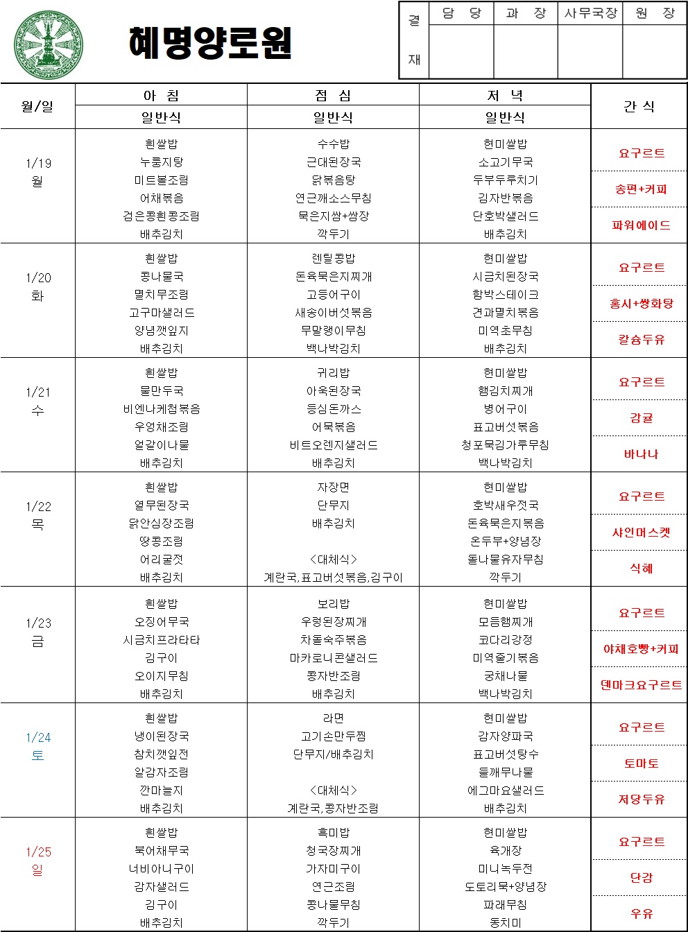 | 1736 | 26년 1월 4주차 주간식단표 | 26-01-19 | 관리자 |