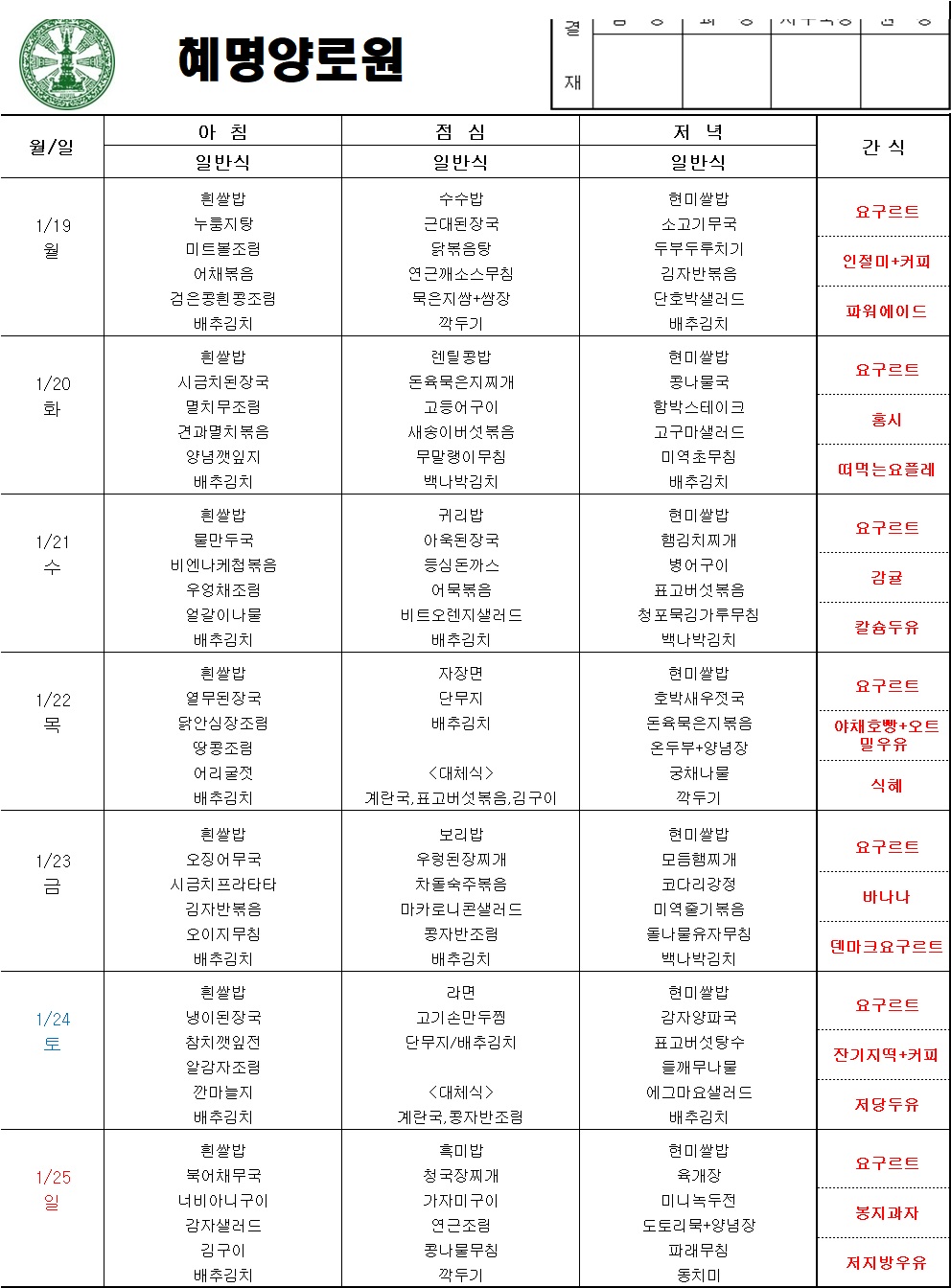 | 1732 | 25년 1월 3주차 주간식단표 | 26-01-12 | 관리자 |