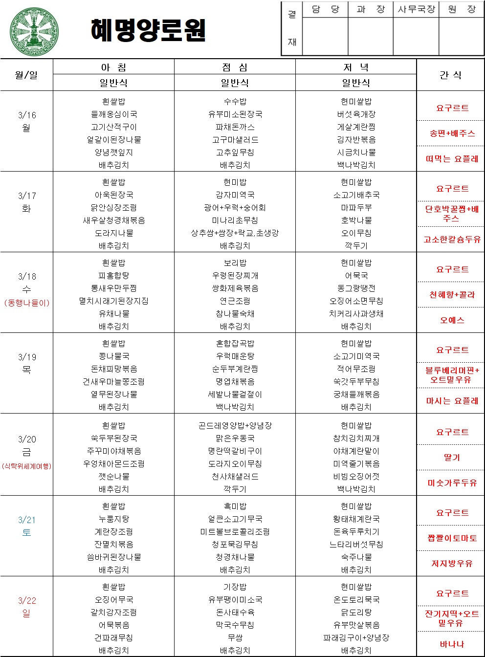26년 3월3주차 주간식단표