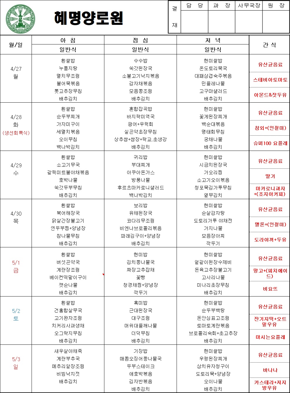 | 1791 | 26년 4월 마지막주 주간식단표 | 26-04-27 | 관리자 |